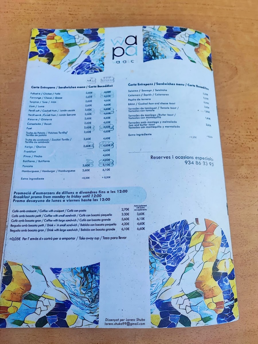 Welcome to Wapa Tapes i Restaurant, a hidden gem nestled in the vibrant Sant Martí district of Barcelona. This charming eatery serves as the perfect after-work destination, offering a delightful array of light bites and refreshing drinks. The menu features decent sandwiches and tapas that cater to both casual diners and those looking for a quick snack, with highlights like zucchini crustless quiche sandwiches that deliver delicious flavors without breaking the bank—some as low as €4.7.